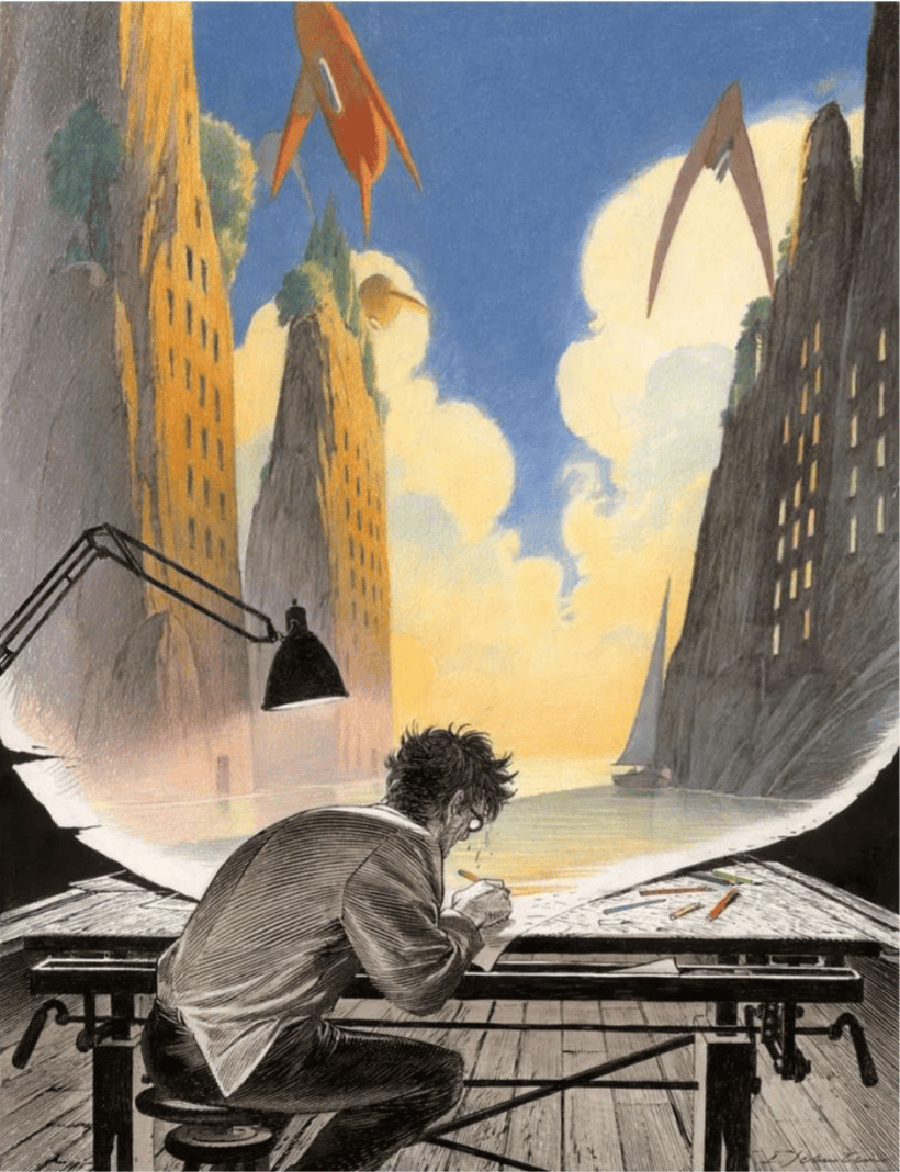 Illustration : François Schuiten, Autoportrait, encre de Chine, lavis, acrylique et crayons de couleur, 46,9 x 36,4 cm, 2003, collection particulière.